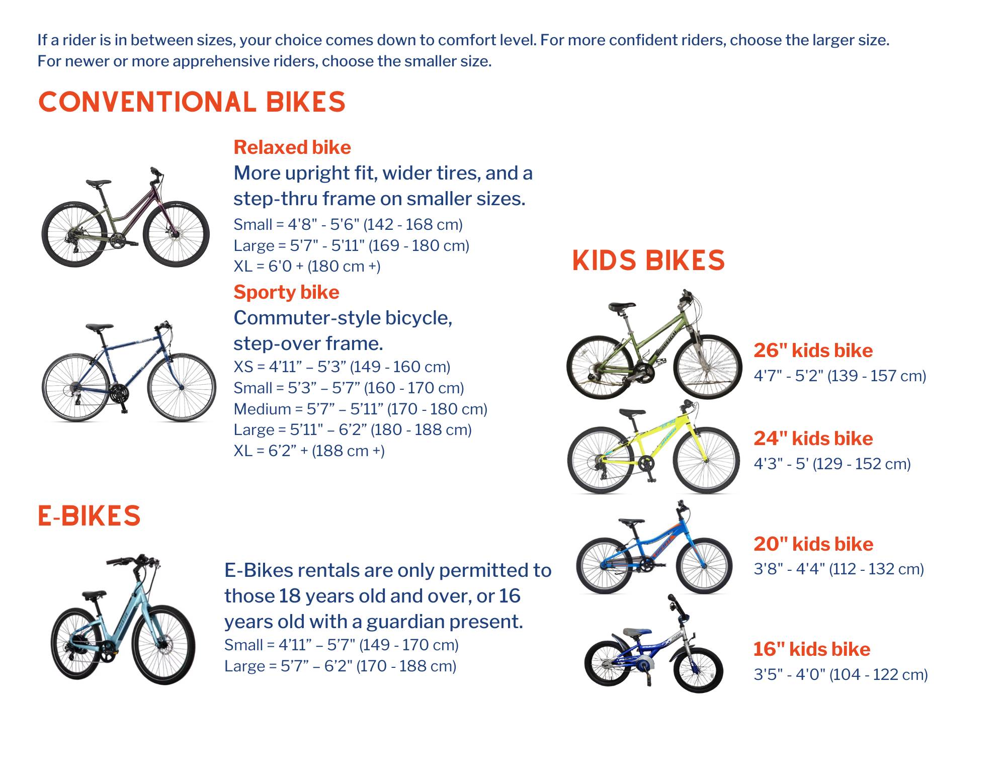 - Please refer to this sizing guide to find your size in our various rental bike options.