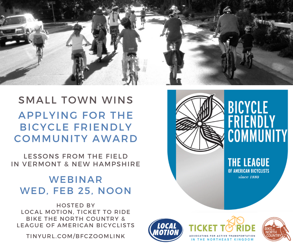 Join Local Motion, local bike advocates, and the League of American Bicyclists for pro tips on applying for the Bicycle Friendly Community (BFC) designation. Learn about the BFC program and how your town could prepare itself to be a good candidate for the designation.