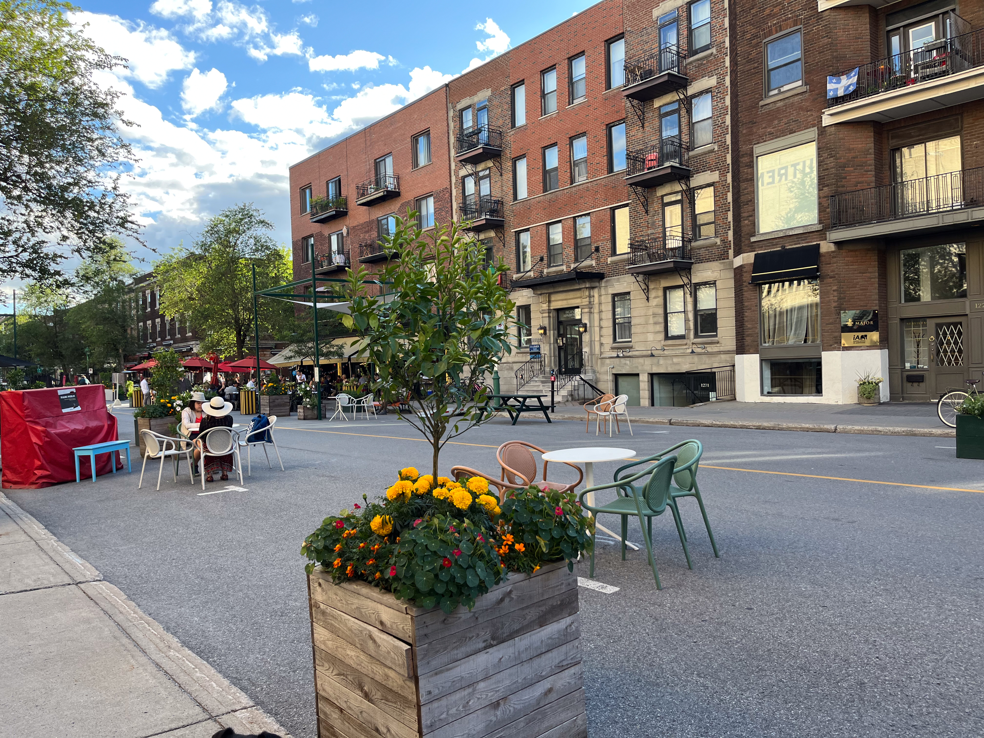 On a warm afternoon in Montreal’s Mile End, I step onto Rue Bernard and find myself immersed in something quietly radical: a street reclaimed for people. To my left, a half dozen café terraces bustle with chatting patrons awaiting their food. To my right, bursts of public art and spontaneous performances animate the walkway. There are flowers, shaded seating nooks, green spaces, and more.